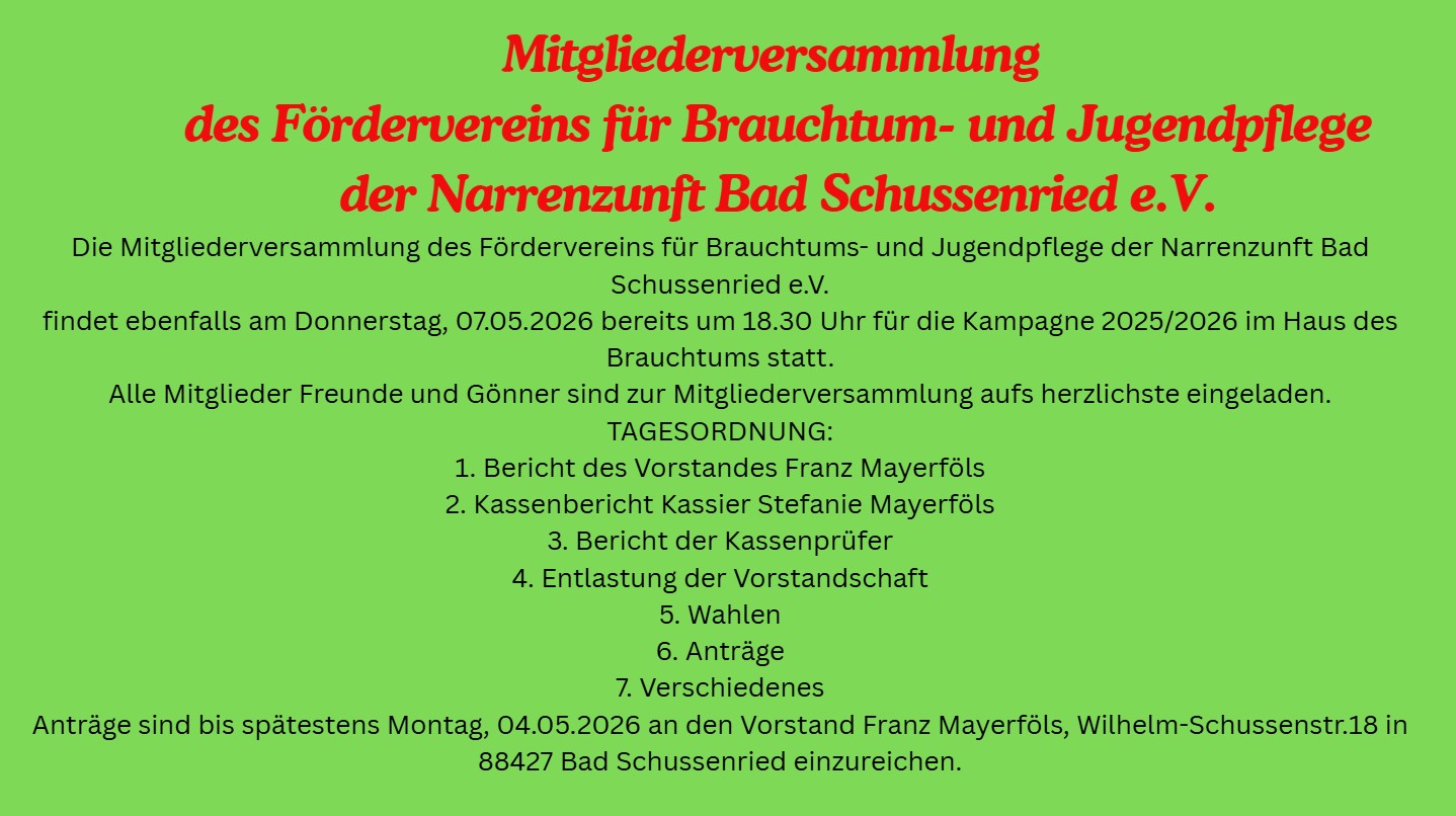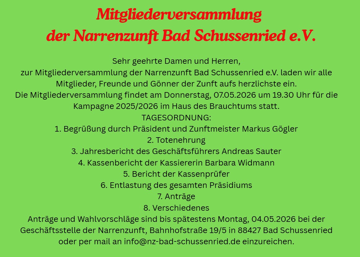 Hier findet Ihr die Termine aller Maskengruppen der Narrenzunft Bad Schussenried.